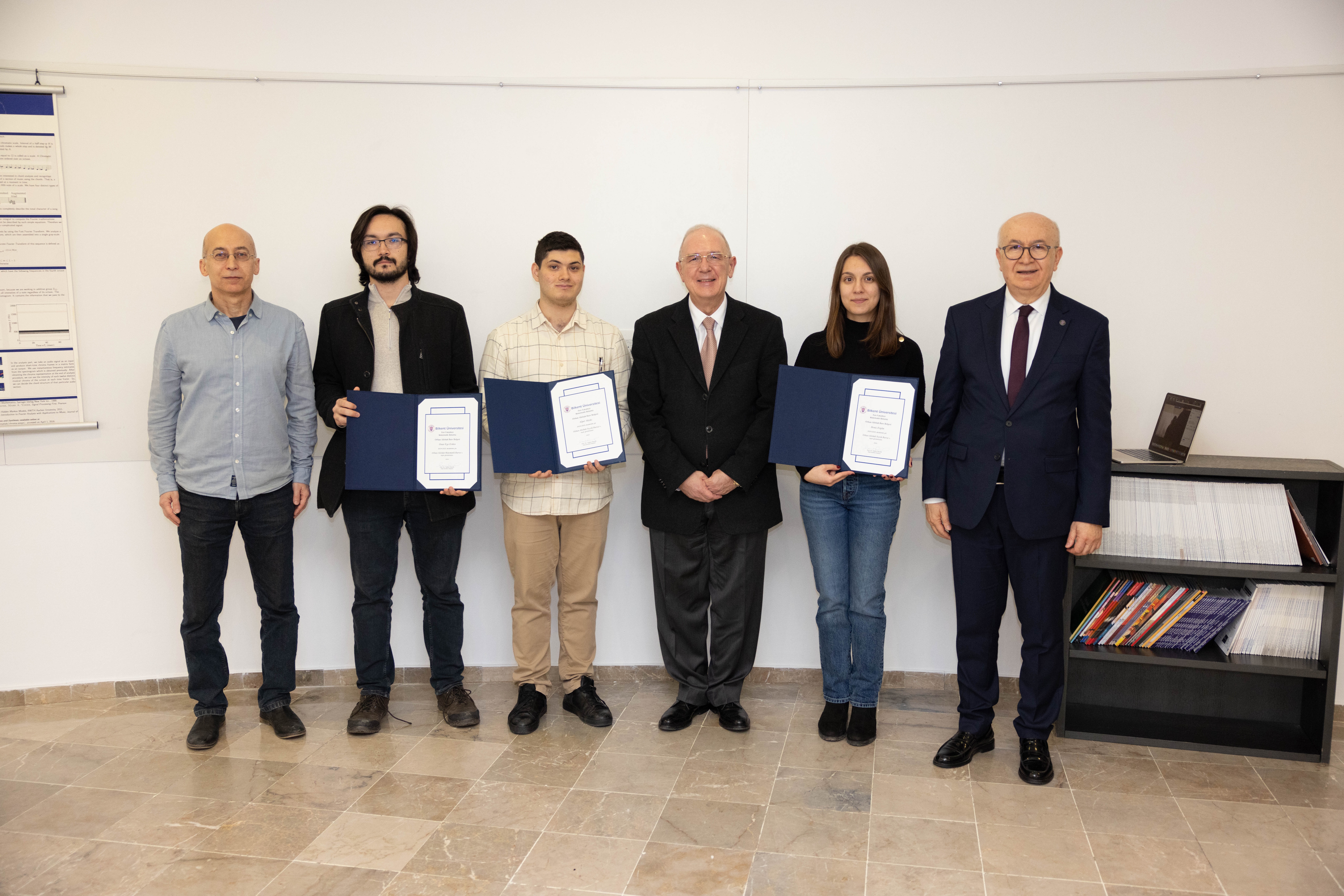 Chairman Prof. Fatihcan Atay, Onur Ege Erden, Alper Akyüz, Dean Prof. Tayfun Özçelik, Deniz Ergün and Rector Prof. Kürşat Aydoğan at the award ceremony.